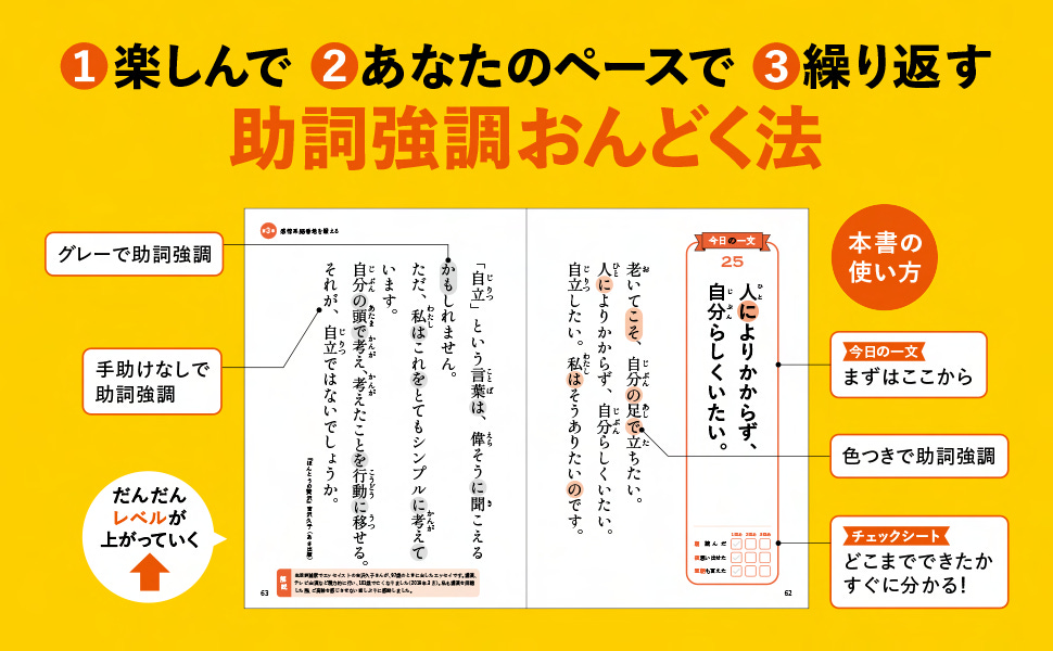 The book’s core method is simple but specific: when reading aloud, emphasize the particles.